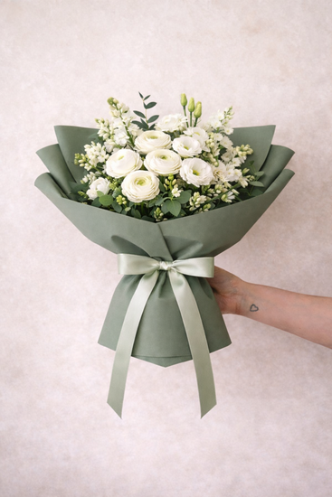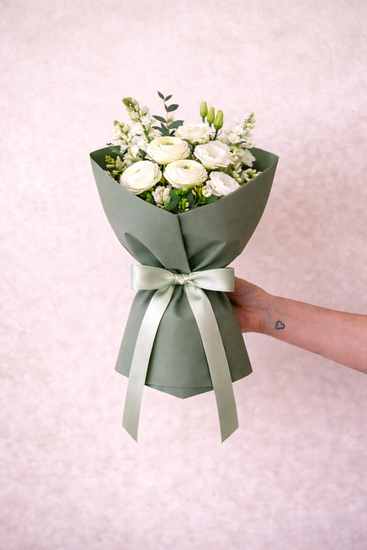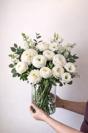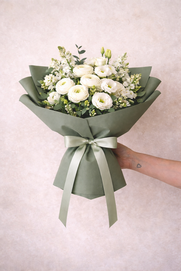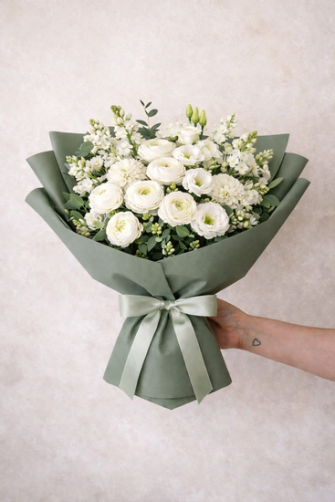 A fresh take on classic white—because white flowers aren’t just for sympathy. This bouquet is all about clean and modern. Creamy white ranunculus, airy lisianthus, and soft snapdragons layered with lush greenery for that effortless, “just stepped out of a European flower market” look.